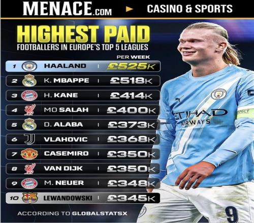 欧洲五大联赛周薪最高球员!姆巴佩周薪485万只排第二莱万323万